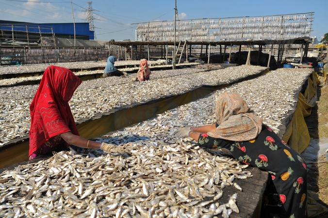 13 December 2025 Chattogram, Bangladesh- Women process fish at an open drying yard in Chattogram, Bangladesh. The fish are cleaned, salted, and sun-dried on bamboo platforms for four to five days, depending on weather conditions. Dry fish processing requires consistent heat and remains a vital food source in Bangladesh, accounting for the fourth-largest share of fish consumption and providing an affordable protein across all income levels. The dried fish are distributed for domestic use and export., Credit:Md Rafayat Haque Khan / Avalon