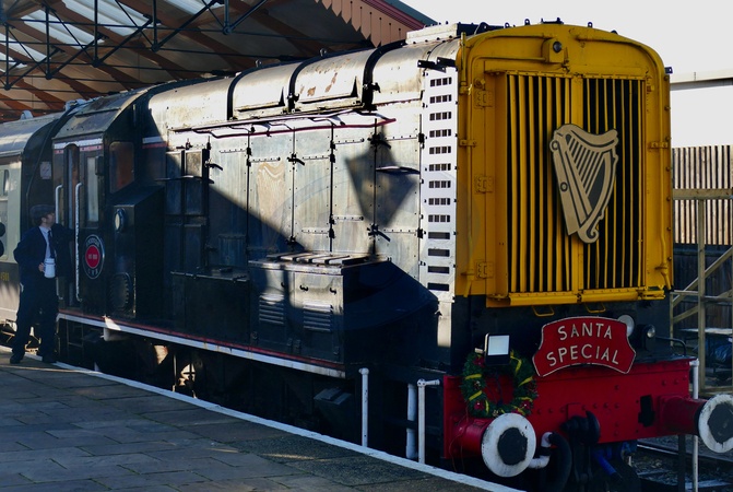 General atmosphere on a sunny day at the Santa Express on The Bunkline at the Cholsey & Wallingford Heritage Railway. Visitors were entertained by Santa's elves, Mother Christmas and would be visited by Father Christmas to receive a present. Before departure adults received a free festive drink and mince pie, and children received a soft drink and a sweet treat from the kiosk. The journey takes approximately an hour travelling through the Oxfordshire countryside and passengers were accompanied throughout by Santa's elves and cheerful team of festive volunteers.The "Guinness train" refers to diesel locomotives, specifically 08 shunters, used at the Cholsey & Wallingford Railway, a heritage line in Oxfordshire, England, that once served the Guinness brewery. These yellow and black industrial shunters, like the famous "Lion" (08022), were acquired from the Park Royal brewery and now run special steam and diesel heritage days for enthusiasts, offering short, scenic trips connecting Cholsey to Wallingford., Credit:Geoffrey Swaine / Avalon