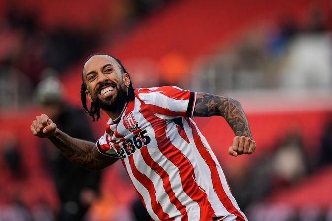 Sorba Thomas of Stoke City celebrates his team winning 2-1 during the Sky Bet Championship match Stoke City vs Swansea City at Bet365 Stadium, Stoke-on-Trent, United Kingdom, 13th December 2025, Credit:Maynard Manyowa/News Images / Avalon