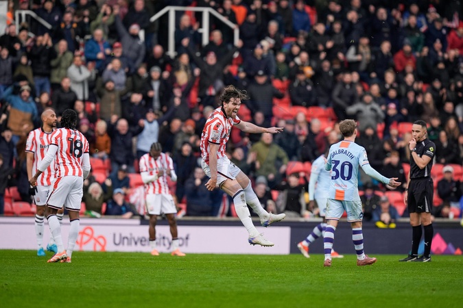 Stoke City players celebrate as the Referee Ruebyn Ricardo blows for full time during the Sky Bet Championship match Stoke City vs Swansea City at Bet365 Stadium, Stoke-on-Trent, United Kingdom, 13th December 2025, Credit:Maynard Manyowa/News Images / Avalon