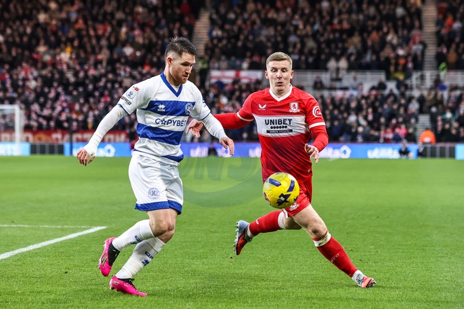 Paul Smyth of Queens Park Rangers and Matt Targett of Middlesbrough battle for the ball during the Sky Bet Championship match Middlesbrough vs Queens Park Rangers at Riverside Stadium, Middlesbrough, United Kingdom, 13th December 2025, Credit:Ae Cosgrove/News Images / Avalon