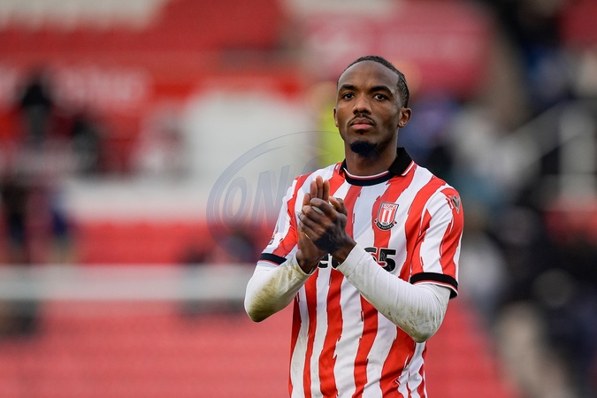 Eric Bocat of Stoke City applauds the fans during the Sky Bet Championship match Stoke City vs Swansea City at Bet365 Stadium, Stoke-on-Trent, United Kingdom, 13th December 2025, Credit:Maynard Manyowa/News Images / Avalon