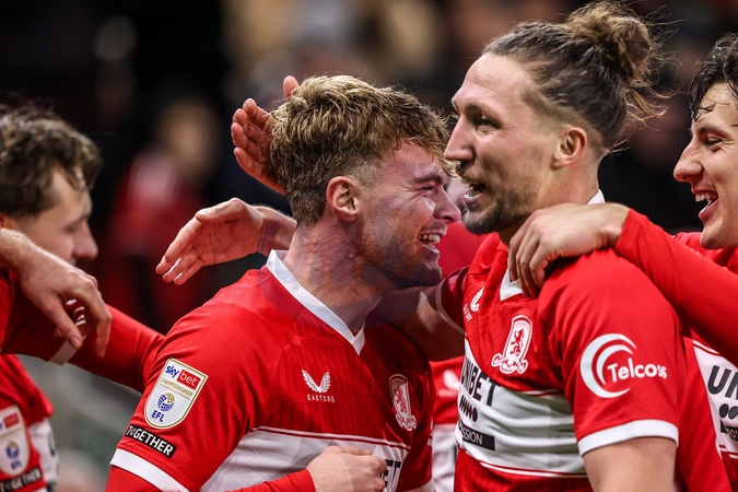 Tommy Conway of Middlesbrough celebrates his goal to make it 3-0 during the Sky Bet Championship match Middlesbrough vs Queens Park Rangers at Riverside Stadium, Middlesbrough, United Kingdom, 13th December 2025, Credit:Ae Cosgrove/News Images / Avalon