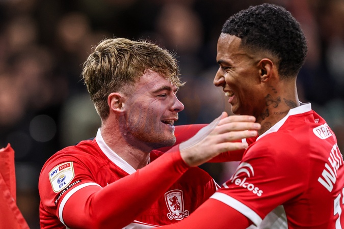 Tommy Conway of Middlesbrough celebrates his goal to make it 3-0 during the Sky Bet Championship match Middlesbrough vs Queens Park Rangers at Riverside Stadium, Middlesbrough, United Kingdom, 13th December 2025, Credit:Ae Cosgrove/News Images / Avalon