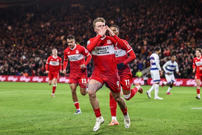 Tommy Conway of Middlesbrough celebrates his goal to make it 3-0 during the Sky Bet Championship match Middlesbrough vs Queens Park Rangers at Riverside Stadium, Middlesbrough, United Kingdom, 13th December 2025, Credit:Ae Cosgrove/News Images / Avalon