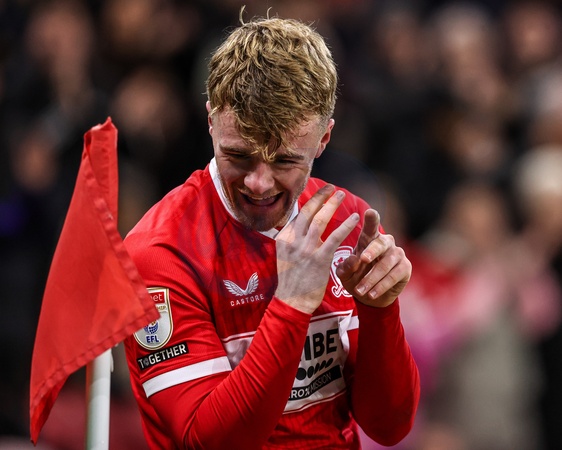 Tommy Conway of Middlesbrough celebrates his goal to make it 3-0 during the Sky Bet Championship match Middlesbrough vs Queens Park Rangers at Riverside Stadium, Middlesbrough, United Kingdom, 13th December 2025, Credit:Ae Cosgrove/News Images / Avalon