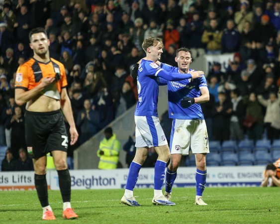 Liam Mandeville of Chesterfield celebrates his goal to make it 3-1 during the Sky Bet League 2 match Chesterfield vs Barnet at SMH Group Stadium, Chesterfield, United Kingdom, 13th December 2025, Credit:Richard Bierton/News Images / Avalon