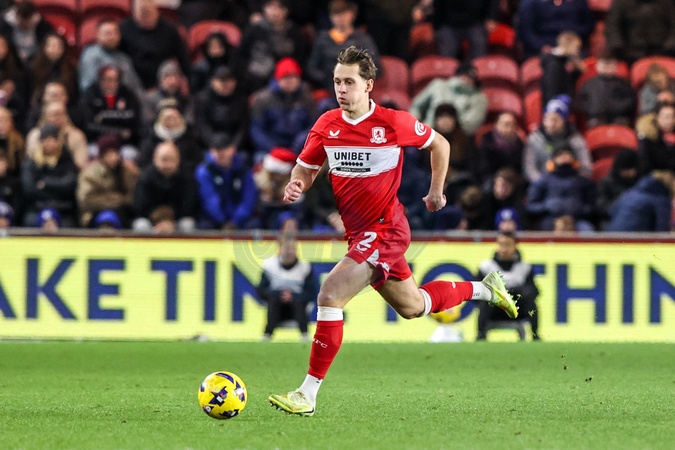 Callum Brittain of Middlesbrough breaks with the ball during the Sky Bet Championship match Middlesbrough vs Queens Park Rangers at Riverside Stadium, Middlesbrough, United Kingdom, 13th December 2025, Credit:Ae Cosgrove/News Images / Avalon