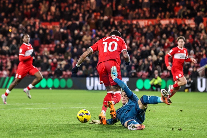 Queens Park Rangers goalkeeper Paul Nardi takes the ball from the feet of Delano Burgzorg of Middlesbrough during the Sky Bet Championship match Middlesbrough vs Queens Park Rangers at Riverside Stadium, Middlesbrough, United Kingdom, 13th December 2025, Credit:Ae Cosgrove/News Images / Avalon