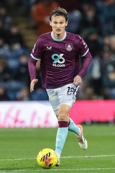 Hjalmar Ekdal of Burnley breaks with the ball during the Premier League match Burnley vs Fulham at Turf Moor, Burnley, United Kingdom, 13th December 2025, Credit:Mark Cosgrove/News Images / Avalon