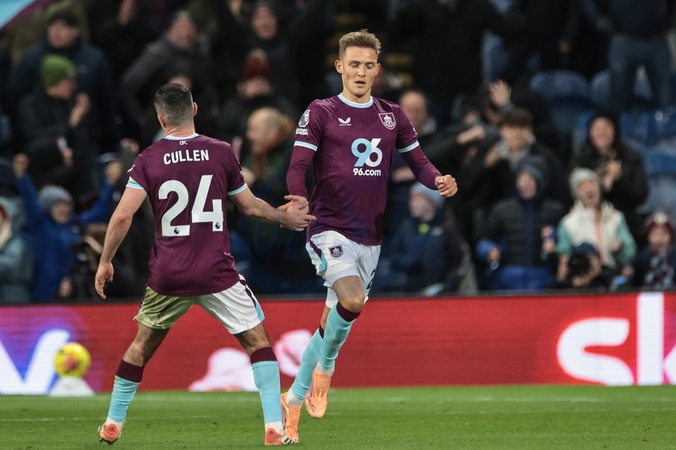 Oliver Sonne of Burnley celebrates his goal to make it 2-3 during the Premier League match Burnley vs Fulham at Turf Moor, Burnley, United Kingdom, 13th December 2025, Credit:Mark Cosgrove/News Images / Avalon