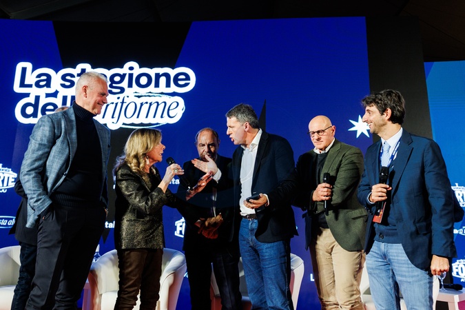 Atreju 2025, Brothers of Italy party, "The Season of Reforms" meeting. Pictured are Minister for Institutional Reforms Maria Elisabetta Alberti Casellati, Giovanni Donzelli, member of the Chamber of Deputies for Brothers of Italy, Matteo Renzi, Secretary of the Democratic Party, Paolo Zangrillo, Minister for Public Administration, Fabio Rampelli, Vice President of the Chamber of Deputies, and Bruno Vespa. Rome, Italy 13 December 2025, Credit:Francesco Fotia / Avalon