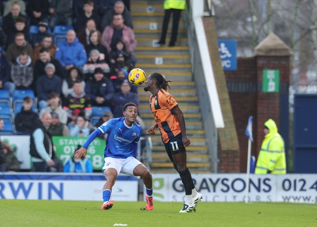 Idris Kanu of Barnet jumps up to win the high ball during the Sky Bet League 2 match Chesterfield vs Barnet at SMH Group Stadium, Chesterfield, United Kingdom, 13th December 2025, Credit:Richard Bierton/News Images / Avalon