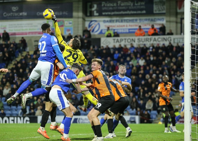 Barnet goalkeeper Cieran Slicker punches the ball clear during the Sky Bet League 2 match Chesterfield vs Barnet at SMH Group Stadium, Chesterfield, United Kingdom, 13th December 2025, Credit:Richard Bierton/News Images / Avalon