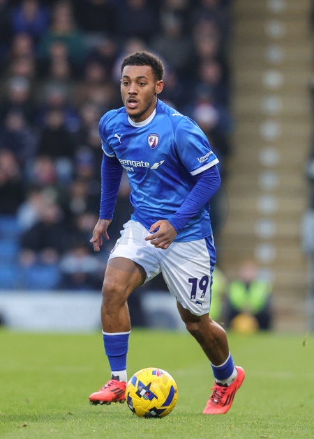 Lewis Gordon of Chesterfield breaks with the ball during the Sky Bet League 2 match Chesterfield vs Barnet at SMH Group Stadium, Chesterfield, United Kingdom, 13th December 2025, Credit:Richard Bierton/News Images / Avalon