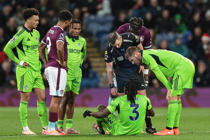 Calvin Bassey of Fulham takes a knock during the Premier League match Burnley vs Fulham at Turf Moor, Burnley, United Kingdom, 13th December 2025, Credit:Mark Cosgrove/News Images / Avalon