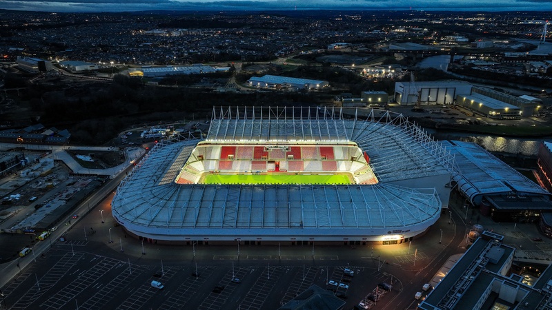 An aerial view of the Stadium Of Light during sunrise ahead of the Premier League match Sunderland vs Newcastle United at Stadium Of Light, Sunderland, United Kingdom, 14th December 2025, Credit:Ae Cosgrove/News Images / Avalon