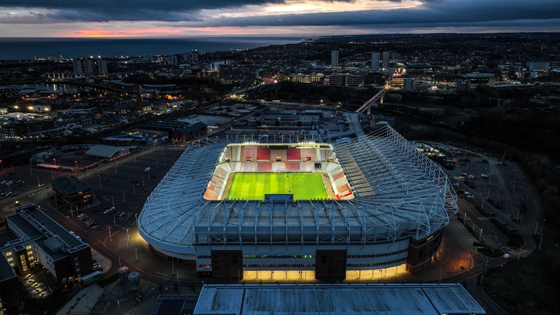An aerial view of the Stadium Of Light during sunrise ahead of the Premier League match Sunderland vs Newcastle United at Stadium Of Light, Sunderland, United Kingdom, 14th December 2025, Credit:Ae Cosgrove/News Images / Avalon