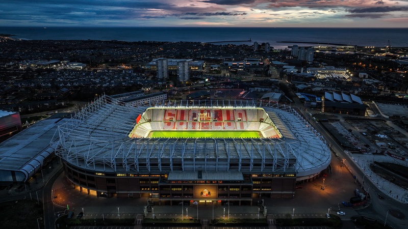 An aerial view of the Stadium Of Light during sunrise ahead of the Premier League match Sunderland vs Newcastle United at Stadium Of Light, Sunderland, United Kingdom, 14th December 2025, Credit:Ae Cosgrove/News Images / Avalon