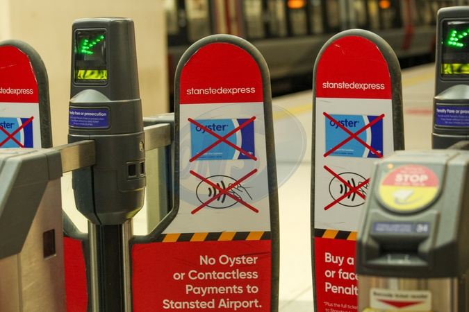 Gateline at London Liverpool Street with signage telling passengers that Oyster or contactless payments can not be used on Great British Railways/Greater Anglia/Stansted Express services to Stansted Airport, London, UK, 13 December 2025, Credit:Alex Day / Avalon