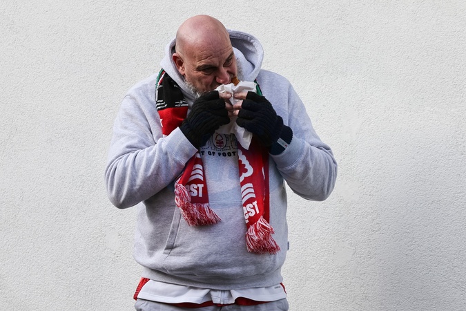 A fan having a bite to eat during the Premier League match Nottingham Forest vs Tottenham Hotspur at City Ground, Nottingham, United Kingdom, 14th December 2025, Credit:Mark Cosgrove/News Images / Avalon
