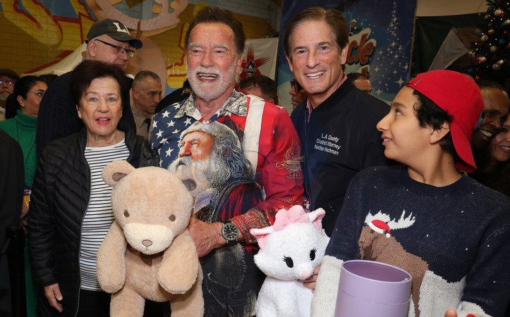 13 December 2025 . Los Angeles, California - Arnold Schwarzenegger, District Attorney Nathan Hochman, Zacky Munoz At THE 44th Annual "Miracle on 1st Street” Christmas Toy Giveaway held at Hollenbeck Youth Center in Los Angeles., Credit:Sadou Faye / Avalon