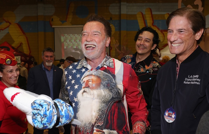 13 December 2025 . Los Angeles, California - District Attorney Nathan Hochman, Arnold Schwarzenegger, Sugar Ray Leonard, At THE 44th Annual "Miracle on 1st Street” Christmas Toy Giveaway held at Hollenbeck Youth Center in Los Angeles., Credit:Sadou Faye / Avalon