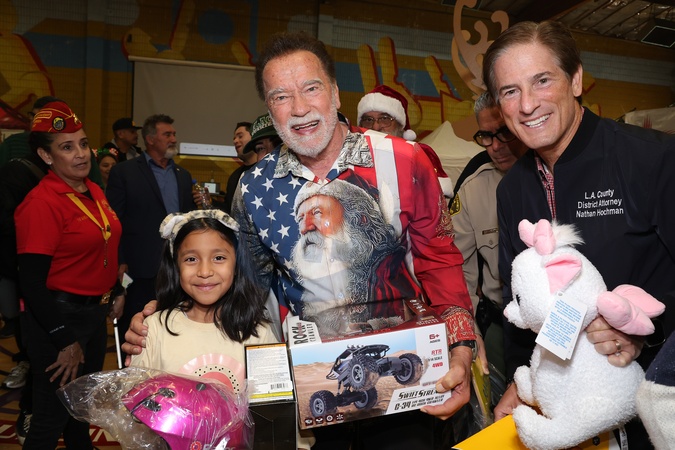 13 December 2025 . Los Angeles, California - District Attorney Nathan Hochman, Arnold Schwarzenegger, Sugar Ray Leonard, At THE 44th Annual "Miracle on 1st Street” Christmas Toy Giveaway held at Hollenbeck Youth Center in Los Angeles., Credit:Sadou Faye / Avalon
