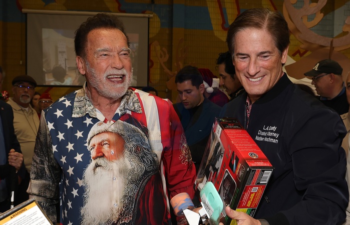 13 December 2025 . Los Angeles, California - District Attorney Nathan Hochman, Arnold Schwarzenegger, Sugar Ray Leonard, At THE 44th Annual "Miracle on 1st Street” Christmas Toy Giveaway held at Hollenbeck Youth Center in Los Angeles., Credit:Sadou Faye / Avalon