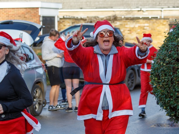 The Teens Unite "Santa Dash" sees over 400 santas run between Broxbourne and Hoddesdon in support of the charity. Teens Unite is the only organisation in the UK to provide ongoing support to 13-24 year old's during and after cancer, Hertfordshire, UK, 14 December 2025, Credit:Alex Day / Avalon