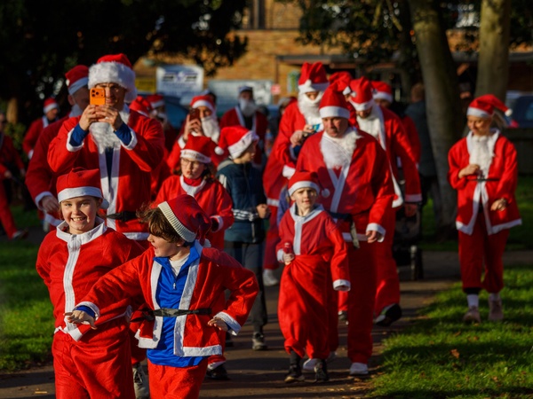 The Teens Unite "Santa Dash" sees over 400 santas run between Broxbourne and Hoddesdon in support of the charity. Teens Unite is the only organisation in the UK to provide ongoing support to 13-24 year old's during and after cancer, Hertfordshire, UK, 14 December 2025, Credit:Alex Day / Avalon