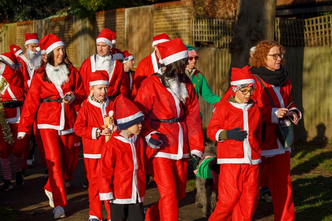The Teens Unite "Santa Dash" sees over 400 santas run between Broxbourne and Hoddesdon in support of the charity. Teens Unite is the only organisation in the UK to provide ongoing support to 13-24 year old's during and after cancer, Hertfordshire, UK, 14 December 2025, Credit:Alex Day / Avalon