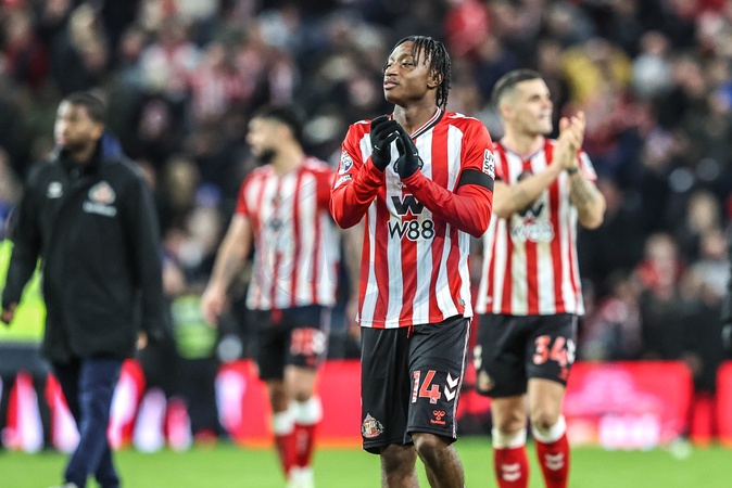 Romaine Mundle of Sunderland applauds the fans after the game during the Premier League match Sunderland vs Newcastle United at Stadium Of Light, Sunderland, United Kingdom, 14th December 2025, Credit:Ae Cosgrove/News Images / Avalon
