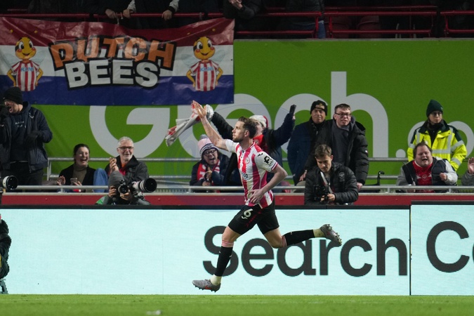 Jordan Henderson of Brentford scores to make it 1-0 during the Premier League match Brentford vs Leeds United at The Gtech Community Stadium, London, United Kingdom, 14th December 2025, Credit:Harvey Murphy/News Images / Avalon