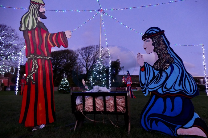A traditional nativity scene at dusk on the village green in the pretty village of Milford on Sea. The three kings and the nativity scene were created by local Milford on Sea artist, Gillian Key., Credit:Geoffrey Swaine / Avalon