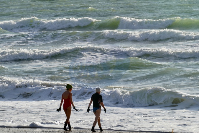 Wild swimmers take to the sea on a cold and blustery day by the coast, Credit:Geoffrey Swaine / Avalon