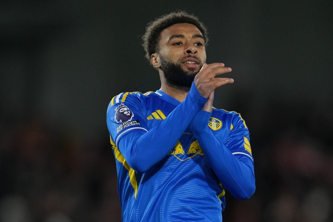 Jayden Bogle of Leeds United applauds away support before kick off during the Premier League match Brentford vs Leeds United at The Gtech Community Stadium, London, United Kingdom, 14th December 2025, Credit:Harvey Murphy/News Images / Avalon