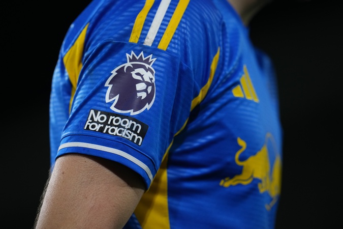 Premier league logo on Leeds United kit during the Premier League match Brentford vs Leeds United at The Gtech Community Stadium, London, United Kingdom, 14th December 2025, Credit:Harvey Murphy/News Images / Avalon