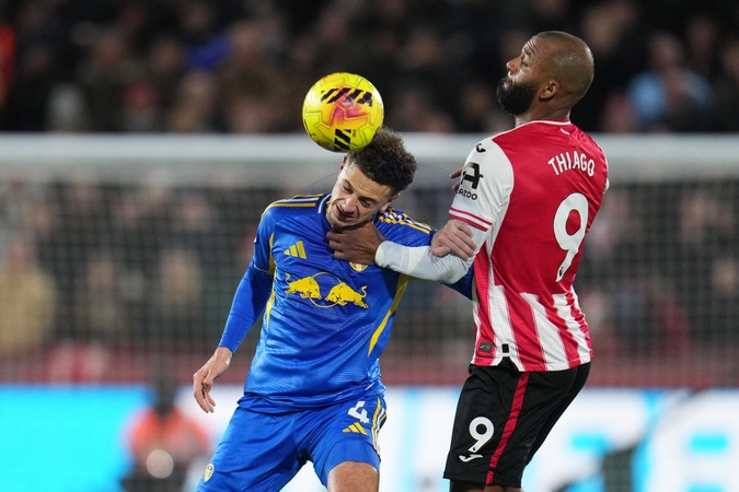 Ethan Ampadu of Leeds United and Igor Thiago of Brentford during the Premier League match Brentford vs Leeds United at The Gtech Community Stadium, London, United Kingdom, 14th December 2025, Credit:Harvey Murphy/News Images / Avalon