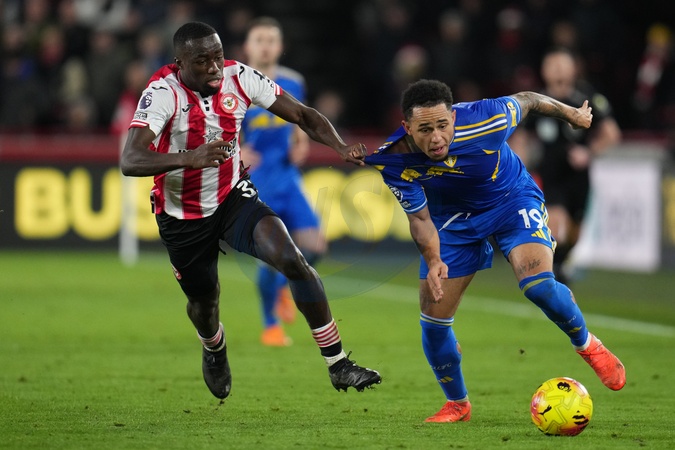 Michael Kayode of Brentford tries to hold back Noah Okafor of Leeds United during the Premier League match Brentford vs Leeds United at The Gtech Community Stadium, London, United Kingdom, 14th December 2025, Credit:Harvey Murphy/News Images / Avalon