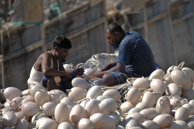 Chattogram, Bangladesh — Fisherman mends and repairs his fishing net on the bank of the Karnaphuli River in Chattogram. Net mending is a routine but essential task for riverine fishermen, reflecting the enduring dependence of coastal communities on traditional fishing practices for their livelihoods., Credit:Md Rafayat Haque Khan / Avalon