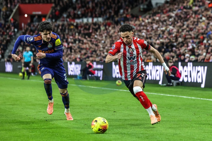 Chemsdine Talbi of Sunderland breaks with the ball under pressure from Tino Livramento of Newcastle United during the Premier League match Sunderland vs Newcastle United at Stadium Of Light, Sunderland, United Kingdom, 14th December 2025, Credit:Ae Cosgrove/News Images / Avalon