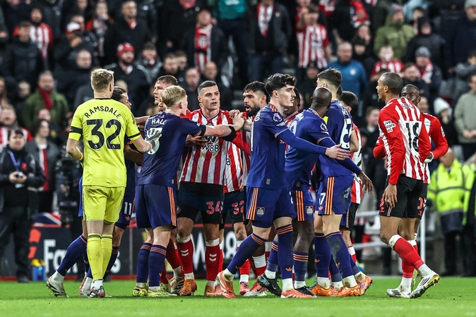 An altercation between the players late in the second half during the Premier League match Sunderland vs Newcastle United at Stadium Of Light, Sunderland, United Kingdom, 14th December 2025, Credit:Ae Cosgrove/News Images / Avalon