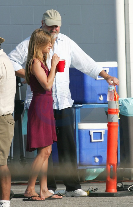 2622. VAN NUYS, CALIFORNIA - Thursday 26 August 2004. Non exclusive. Jennifer Aniston talks to director Rob Reiner on the set of 'Otherwise Engaged' at Van Nuys Airport. Aniston's black bra was slightly visible as she shared a joke with Reiner. Reiner replaced the film's original director, Ted Griffin, just 12 days into shooting. Co-star Kevin Costner was also on the set. Photograph: Pacificcoastnews.com. A division of BWP Media.***FEE MUST BE AGREED PRIOR TO USAGE ***UK OFFICE: +44 131 225 3333/3322US OFFICE: 1 310 261 9676 High Rates High Rates, Credit:Andrew Shawaf / Avalon