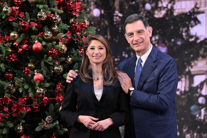 Rai1. In the studio of the TV program Uno Mattina News, its Christmas version. Pictured are hosts Maria Soave and Tiberio Timperi. Rome, Italy 15 december 2025, Credit:Maria Laura Antonelli / Avalon