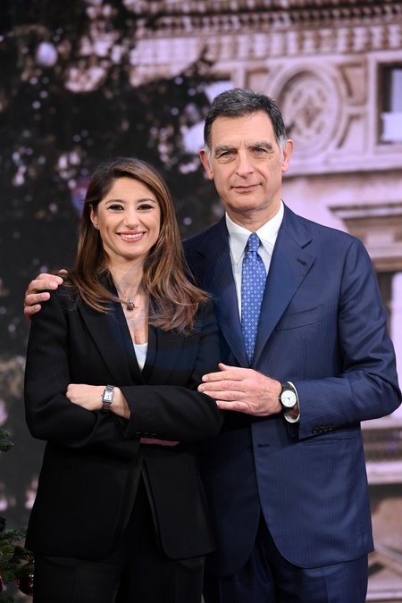 Rai1. In the studio of the TV program Uno Mattina News, its Christmas version. Pictured are hosts Maria Soave and Tiberio Timperi. Rome, Italy 15 december 2025, Credit:Maria Laura Antonelli / Avalon