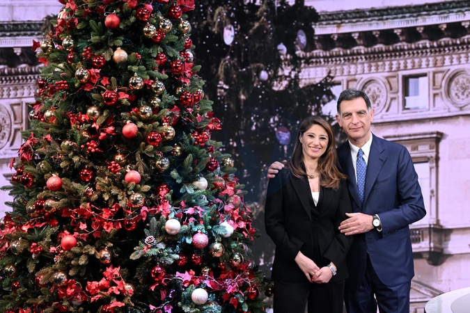 Rai1. In the studio of the TV program Uno Mattina News, its Christmas version. Pictured are hosts Maria Soave and Tiberio Timperi. Rome, Italy 15 december 2025, Credit:Maria Laura Antonelli / Avalon