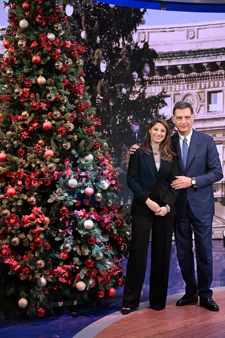 Rai1. In the studio of the TV program Uno Mattina News, its Christmas version. Pictured are hosts Maria Soave and Tiberio Timperi. Rome, Italy 15 december 2025, Credit:Maria Laura Antonelli / Avalon