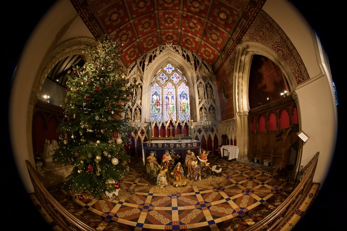 A traditional nativity scene in St. Andrews Church. The traditional nativity story tells of Mary and Joseph traveling to Bethlehem for a Roman census, where no room was available at the inn, so Jesus was born in a stable and laid in a manger. Shepherds, guided by angels, and later, Wise Men (Magi) following a star, visited the baby, bringing gifts like gold, frankincense, and myrrh, while Joseph was warned in dreams to flee to Egypt to escape King Herod's jealousy. The traditional nativity scene's history begins with St. Francis of Assisi staging the first living nativity in Greccio, Italy, in 1223, using real people and animals to convey the humility of Christ's birth, a practice that spread quickly. It evolved from live enactments to static displays with figures, Credit:Geoffrey Swaine / Avalon