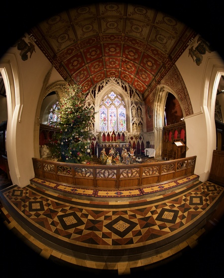 A traditional nativity scene in St. Andrews Church. The traditional nativity story tells of Mary and Joseph traveling to Bethlehem for a Roman census, where no room was available at the inn, so Jesus was born in a stable and laid in a manger. Shepherds, guided by angels, and later, Wise Men (Magi) following a star, visited the baby, bringing gifts like gold, frankincense, and myrrh, while Joseph was warned in dreams to flee to Egypt to escape King Herod's jealousy. The traditional nativity scene's history begins with St. Francis of Assisi staging the first living nativity in Greccio, Italy, in 1223, using real people and animals to convey the humility of Christ's birth, a practice that spread quickly. It evolved from live enactments to static displays with figures, Credit:Geoffrey Swaine / Avalon